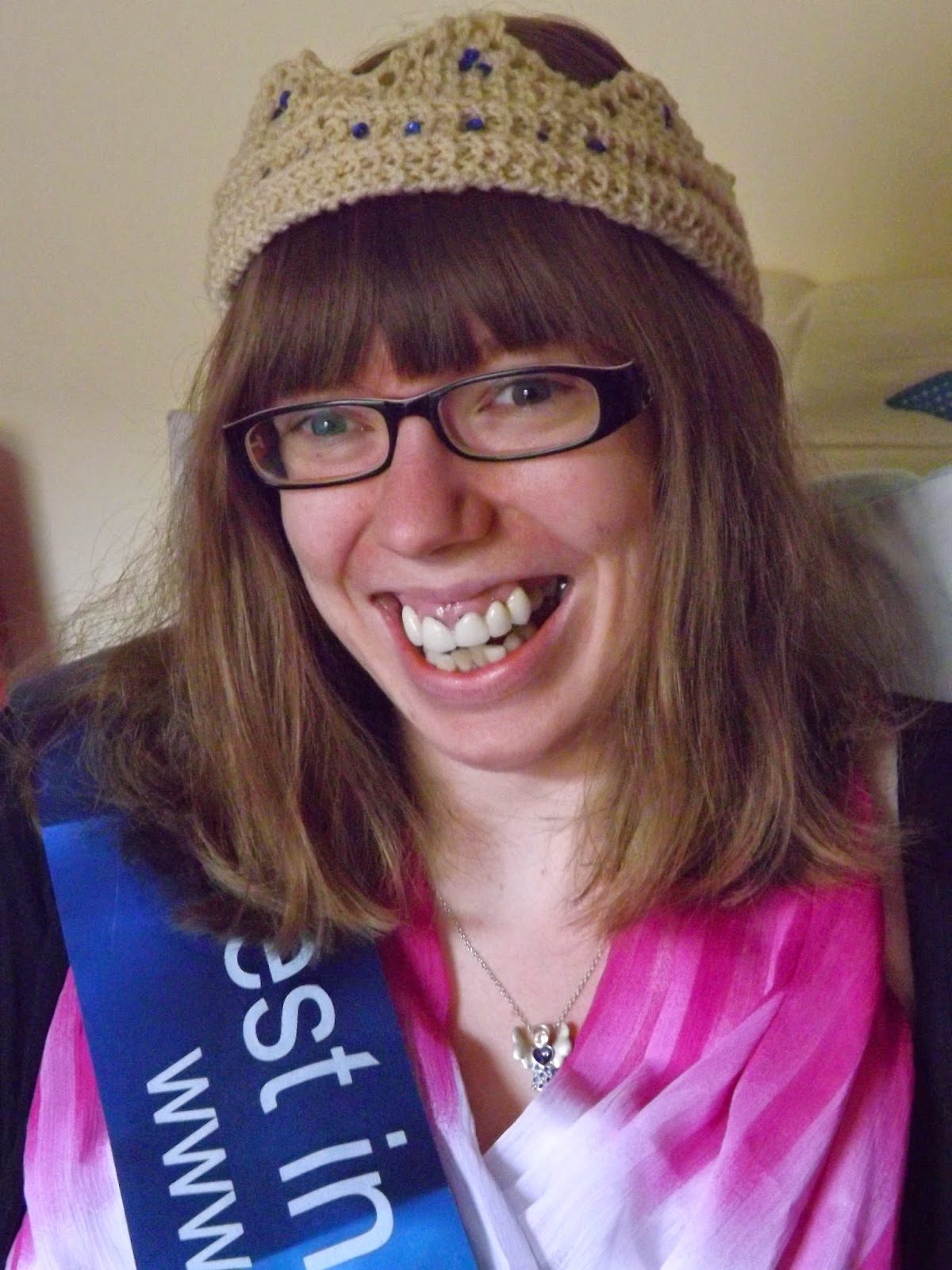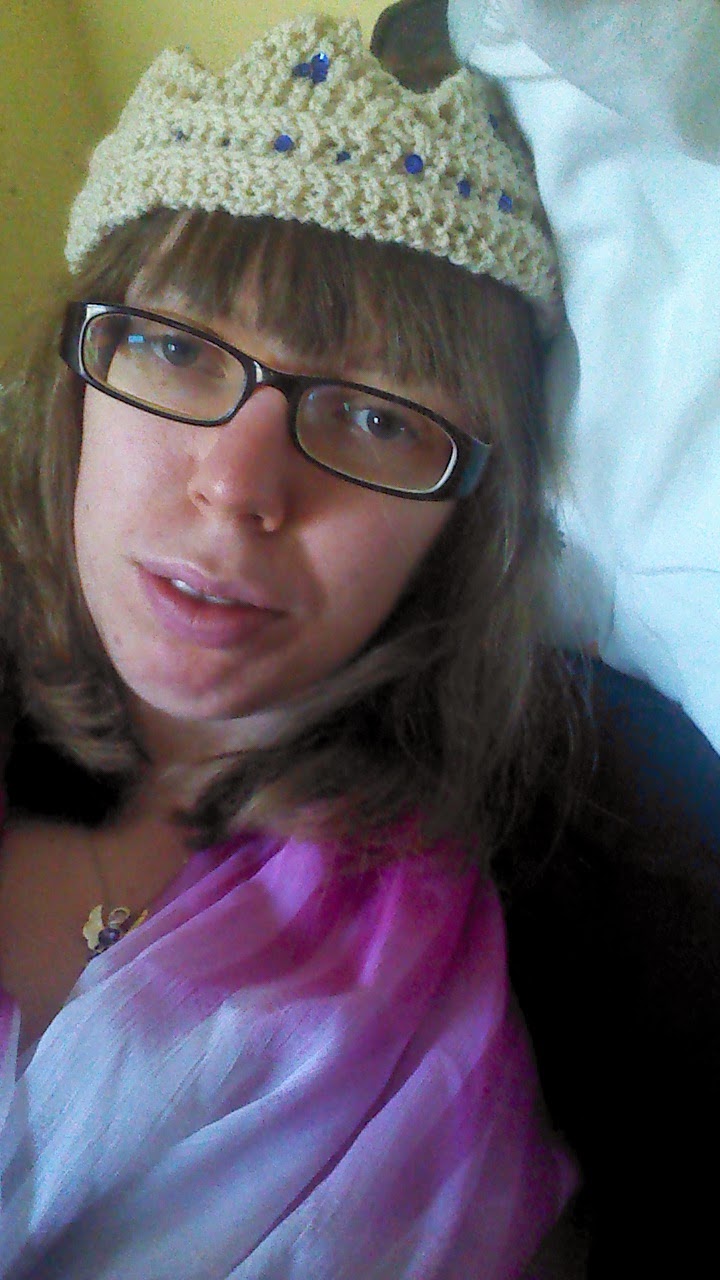 | My hand knitted tiara, complete with blue sequin jewels |
